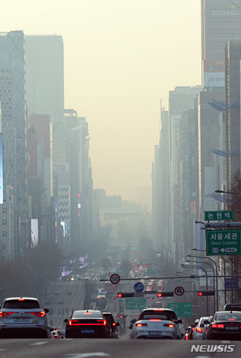 【NEWSIS】ソウルをはじめとする中部地方でPM2.5(微小粒子状物質)濃度が高い水準となった13日、ソウル・江南のビル街はかすんでいた。
