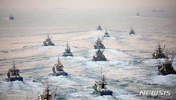 【NEWSIS】韓国国内のサバ漁獲量の80%以上を占める大型まき網漁船約60隻が13日午前、釜山市西区の釜山共同魚市場で、旧正月連休明けの初操業のため一斉に出港した。大型まき網漁船の1船団は本船(網..