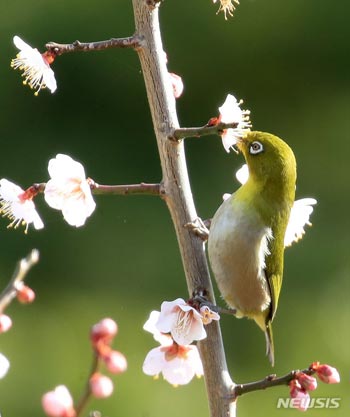 気温が上がって春の気運が漂う13日午前、済州島西帰浦市のコルメ生態公園では、メジロがウメの花の蜜を吸っていた。