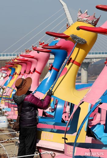 温かい天気となった13日、大邱市東区の東村遊園地にあるスワンボートの船着き場では、管理人が、冬の間に溜まった汚れを洗い落として客を迎える準備をしていた。