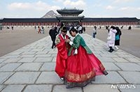旧正月(今年は2月10日)の連休初日の9日、無料開放が始まったソウルの景福宮では、訪れた観光客が楽しいひとときを過ごしていた。