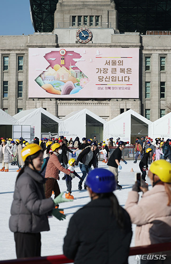 旧正月(今年は2月10日)の連休最終日の12日午後、ソウル広場スケート場を訪れた市民がスケートを楽しんでいる様子。昨年12月22日にオープンしたソウル広場スケート場は、この日の午後6時30分まで運営さ..