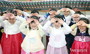 旧正月(今年は2月10日)連休を控えた7日、釜山市内にある釜山鎮区庁保育園で、韓服(韓国の伝統衣装)を着た園児たちが、両手の甲を額に当てて頭を下げる韓国式の最も丁寧なお辞儀「クンジョル」のやり方を学..