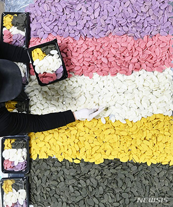 旧正月(今年は2月10日)まであと三日と迫った7日、京畿道水原市長安区の亭子市場にある餅店では、従業員が五色カレトック(細長い棒状の餅)を包装にいそしんでいた。