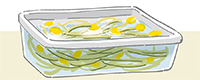 料理に使って残ってしまった豆もやしはヒゲ根を取り、密閉容器に水と一緒に入れて冷蔵保存すると、新鮮さが長持ちする。