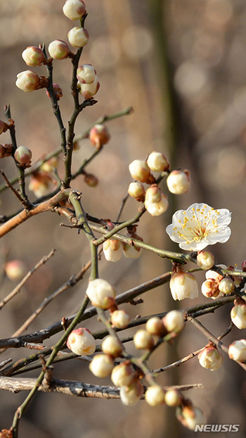 【NEWSIS】北極からの寒波が一段落した30日午前、蔚山市南区の仙岩湖水公園で、春の訪れを告げる梅のつぼみが開いた。