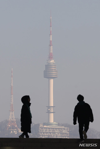 ソウル地域でPM2.5などの微小粒子状物質の濃度レベルが「不良」となった30日午前、ソウル市竜山区の国立中央博物館から眺めたNソウルタワーは白くかすんでいた。