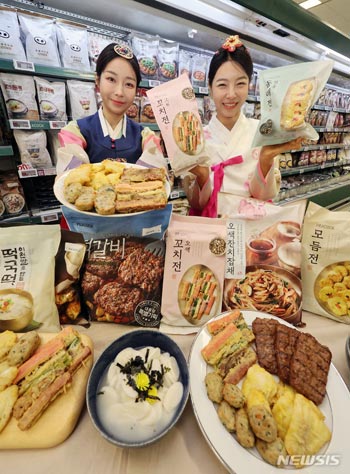 ソウル市竜山区の大手スーパー「Eマート竜山店」で30日午前、簡便食ブランド「PEACOCK簡便祭需用品」の商品をPRしているコンパニオンの様子。