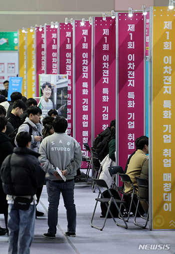 24日、慶尚北道浦項市南区のPOSTECH室内体育館で開かれた「第1回 二次電池特化企業就業マッチングデー」を訪れた就職希望者らが、企業の採用担当者らと相談している様子。