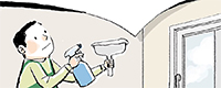 はがれた壁紙に霧吹きで水をかけて湿らせ、接着部分にのりを塗って貼ると、水が乾いて壁紙がぴったりと貼り付く。