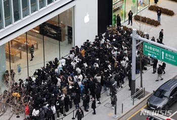 20日午前、ソウル市麻浦区のアップル弘大オープンイベントを訪れた市民たちが長い列をつくっている。