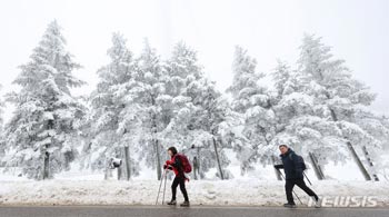 【NEWSIS】21日、江原道平昌郡の大関嶺にある仙子嶺登山路で、雪道を歩く登山客。