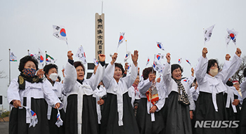 済州市旧左邑の海女抗日運動記念塔広場で12日午前、「最終海女抗日運動92周年記念式典」追悼祭が行われ、海女たちが万歳三唱を行った。