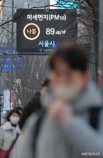 【NEWSIS】ソウル全域で粒子状物質(PM10)の濃度が上がった12日、ソウル市中区にあるソウル市庁近くの様子。濃度を示す電光掲示板の下を歩く人々はマスク姿が目立った。