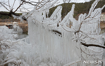 【NEWSIS】気温が氷点下まで下がった9日午前、蔚山市南区の仙岩湖水公園では、木の枝に大きな「つらら」ができていた。