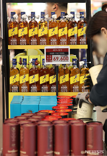 ソウル市内の大手スーパー「Eマート」で5日、人気ウイスキーが特別価格で販売されている様子。Eマートは、新年に合わせて5日と6日の二日間、バルヴェニー・マッカラン・サントリー角瓶・ジムビーム・シングルト..