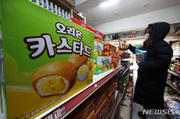 オリオンが、食中毒を引き起こす黄色ブドウ球菌が検出された菓子製品「カスタード」およそ590箱の回収を進めている。写真は4日午後、ソウル市内のある食料品店に陳列されているオリオンの「カスタード」。