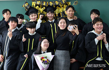5日、ソウル市城東区の徳寿高校杏堂分校で開かれた卒業式で、卒業生らと先生が記念撮影をしている。徳寿高校杏堂分校(特性化系列)は今年で閉校になり、一般系列は昨年、松坡区の慰礼新都市に移転した。