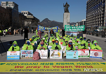 韓国菜食主義連合、ヴィーガン(Vegan)世界のための市民の会などのメンバーが23日、ソウル・光化門の李舜臣銅像前で「ヴィーガン世界のための50人の祈り」記者会見を開いているところ。一同は、菜食によっ..