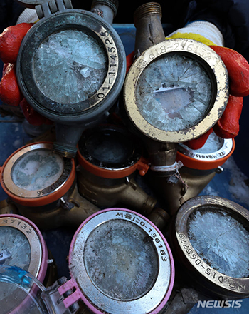 厳しい寒さが続き、水道メーターや水道管の凍結など、全国で被害が相次いでいる中、ソウル市鍾路区の中部水道事業所孝子加圧場では22日午前、職員らが凍結した水道メーターを整理していた。