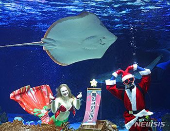 京畿道水原市霊通区のアクアプラネット光教で21日午前、アクアリストがクリスマスのあいさつをしている様子。