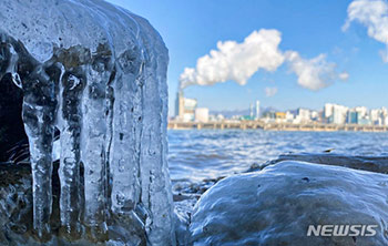 今冬最も強い寒さとなった21日午前、慶尚南道南海郡二東面の海岸では白く氷が張り、最強の寒波の到来を実感させる光景が広がっていた。