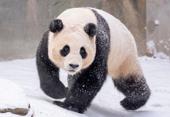 エバーランド(京畿道竜仁市)のパンダワールドで20日、雪原を歩き回って遊ぶパンダの「福宝(フーバオ)」。