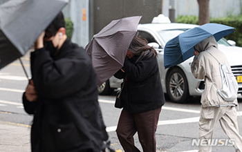 11日午前、ソウル市鍾路区の街角で、雨傘を差して歩みを急ぐ市民の様子。