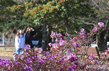 昼間の気温が20度を上回るなど温かい天気となった8日午後、済州大学のグラウンドでは春に咲くはずのツツジが大きく開花し、異色の趣を漂わせていた。