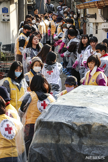 大韓赤十字社ソウル支社のボランティアと「高麗亜鉛」の社員らが8日、ソウル市芦原区上溪3・4洞に位置する希望村6統付近で、恵まれない人々のための練炭分かち合いボランティア活動を行っているところ。