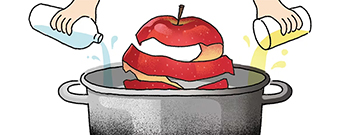 底が焦げ付いてしまった鍋は、水、リンゴ1個分の皮、酢を100CC入れて5分間ほど沸騰させる。すると、リンゴのクエン酸という成分で焦げ付き汚れがはがれ、簡単に洗い流すことができるようになる。