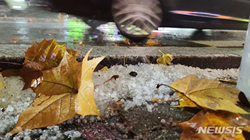 【NEWSIS】6日午後、釜山市釜山鎮区の歩道で、落ち葉の間にたまっていた「ひょう」。釜山気象庁は同日、雲の中で強い上昇気流が発生する地域で、ひょうが降る可能性があると予報していた。