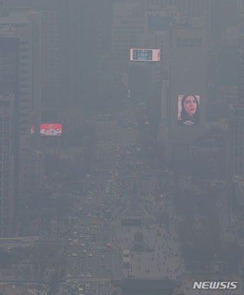 韓国各地でPM2.5の濃度が「悪い」の水準となった6日午後、ソウル市鍾路区の北岳山から見下ろしたソウル都心は灰色に霞んでいた。