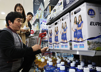 中国の尿素輸出保留措置により韓国国内の需給にずれが生じる恐れが続いている6日午前、ソウル市内の大手スーパー「ロッテマート・ロッテワールドタワー店(ソウル市松坡区)」で、商品の尿素水を整理する従業員の様..