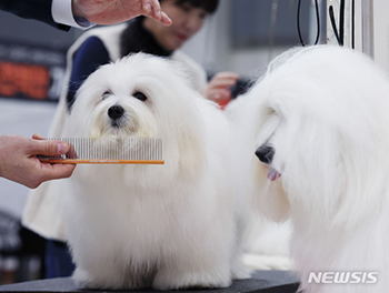 1日、ソウルの良才aTセンターにて開催の「2023コリア・プレミア・ドッグショー」に出展されるイヌたちが、競演を前に美容を受けている様子。