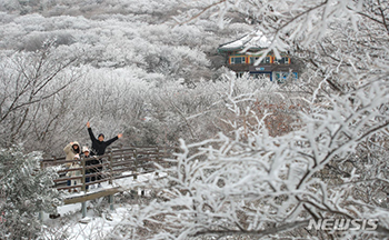 済州の山間地域にかなりの雪が降った1日午前、済州・漢拏山1100高地の湿地では、観光に訪れた人々が「雪の花」を鑑賞しつつ楽しいひとときを過ごしていた。
