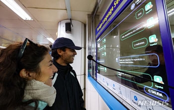 4日午後、ソウル地下鉄4号線明洞駅で「外国語同時対話システム」を利用している外国人観光客の様子。この日から明洞駅で試験運用に入った外国語同時対話システムは、透明OLEDディスプレイを通して外国人と職員..