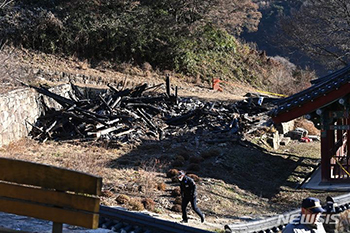京畿道安城市竹山面七長里にある七長寺の寮舎(僧侶の宿舎)が29日午後に発生した火災により全焼した。写真は30日、火災現場の様子。