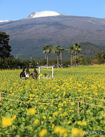 【NEWSIS】寒さが和らぎ、例年並みの気温に戻った19日午前、済州特別自治道西帰浦市内の農場では、観光客たちが時ならぬ菜の花にかこまれ、楽しいひとときを過ごした。気象庁によると、19日の最高気温は..