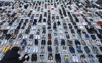 パレスチナと連帯する韓国市民社会緊急行動のメンバーたちが17日午前、ソウル市鍾路区の普信閣前で、パレスチナの犠牲者を追悼するため、靴を置くパフォーマンスを繰り広げた。