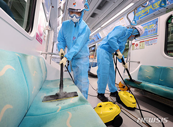 韓国各地へのトコジラミ拡大が懸念される中、仁川市南洞区の仁川交通公社雲宴車両事業所で13日、関係者らが仁川地下鉄2号線の列車内でスチーム清掃機を用いて物理的防疫を行っている様子。仁川交通公社は、先手を..