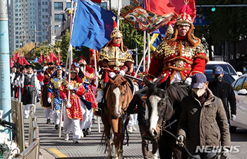 第41回南怡将軍祠堂祭が開かれた13日午前、ソウル市竜山区の南怡(ナム・イ)将軍の祠堂付近で、南怡将軍出陣の様子を再現した行列が行進している様子。