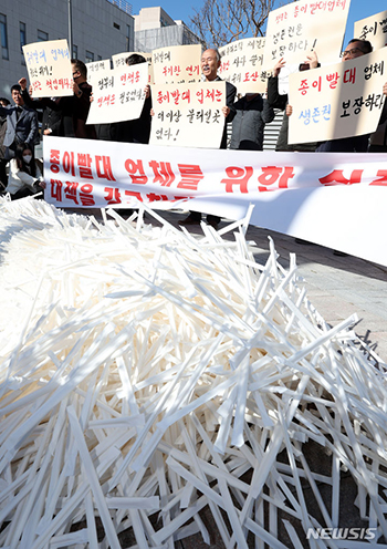 紙ストローのメーカー代表などが13日、世宗市の政府世宗庁舎環境部(省に相当)前で、韓国政府が今月7日に発表したプラスチックストロー規制無期限延期の撤回と紙ストロー製造および販売業者の生存対策整備を求め..