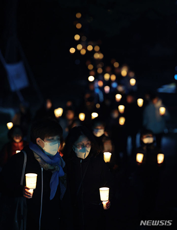 2024年度大学修学能力試験まであと五日と迫った11日の夜、ソウル市江南区の奉恩寺で開かれた「学業円満成就祈祷ろうそく祈願法会」に参加した保護者らが、子どもの学業成就を祈っている様子。
