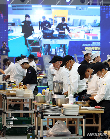 7日、ソウル市良才洞のaTセンターで開かれた「2023国際軍人料理大会」創作料理、軍テリア(韓国軍で将兵に提供されるハンバーガー)競演に参加した軍将兵らが、軍テリアを作っているところ。