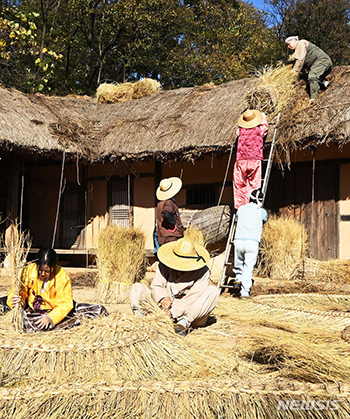 二十四節気の一つ「立冬」があすに迫った7日、京畿道竜仁の韓国民俗村では、関係者らが草葺き屋根の葺き替え作業を行って冬に向けた準備を進めていた。
