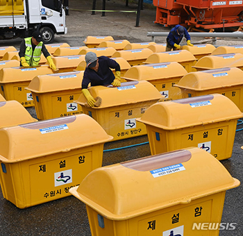 二十四節気の一つ「立冬」まであと二日と迫った6日、京畿道水原市長安区庁の安全建設課資材倉庫で、関係者が除雪箱を洗浄して冬の準備を行っている。