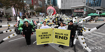 ソウル市西大門区新村のスター広場で1日午前、国際プラスチック条約の策定に向けた第3回政府間交渉委員会(INC3、ケニア・ナイロビで11月13日開催)を前に、国際プラスチック条約を求める「プラスチックの..