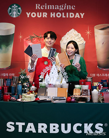 ソウル市中区のスターバックス・プレスセンター店で1日に開かれたクリスマス・プロモーションの開始イベントにて、謝恩品を紹介するコンパニオンの様子。スターバックスは、クリスマスに合わせて2日から、プロモー..