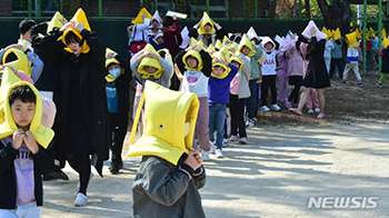 大邱市寿城区の黄金幼稚園で30日、2023年災難対応安全韓国訓練が行われ、子どもたちが防災頭巾をかぶって地震避難訓練に臨んだ。